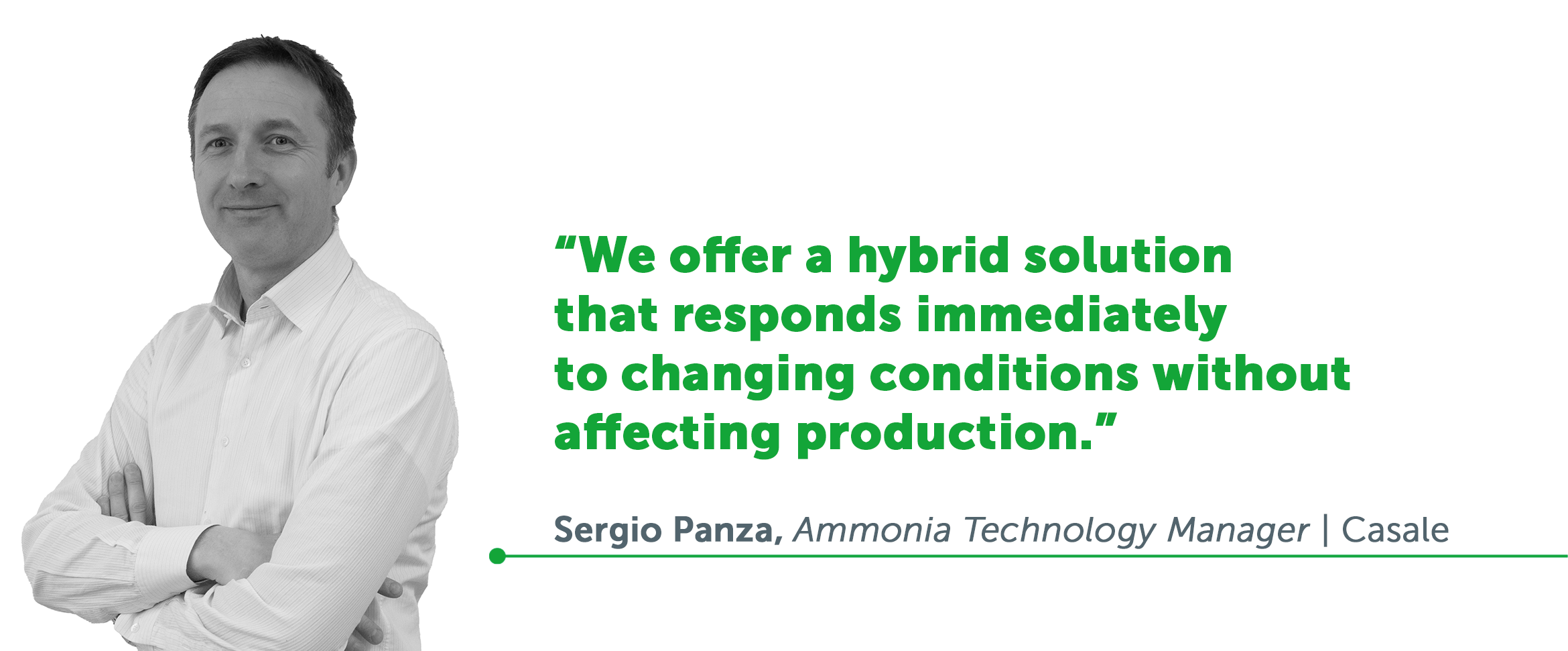With hybridization, green hydrogen made on site from renewable resources is used to replace some or all of your plant’s carbon-based feedstock (usually natural gas), having an immediate, cost-effective impact. It is an incredibly flexible strategy, that allows operators to produce more grey ammonia in winter and more green ammonia in summer when green hydrogen availability is at its peak.